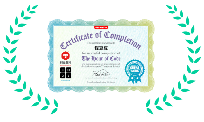 編程一小時(The Hour of Code)是一個全球性的公益活動,并獲得了比爾蓋茨、扎克伯格等科技精英的大力支持,連美國前總統奧巴馬都學習過。孩子們在創豆編程完成階段學習后將獲得國際認證的《編程一小時證書》。
